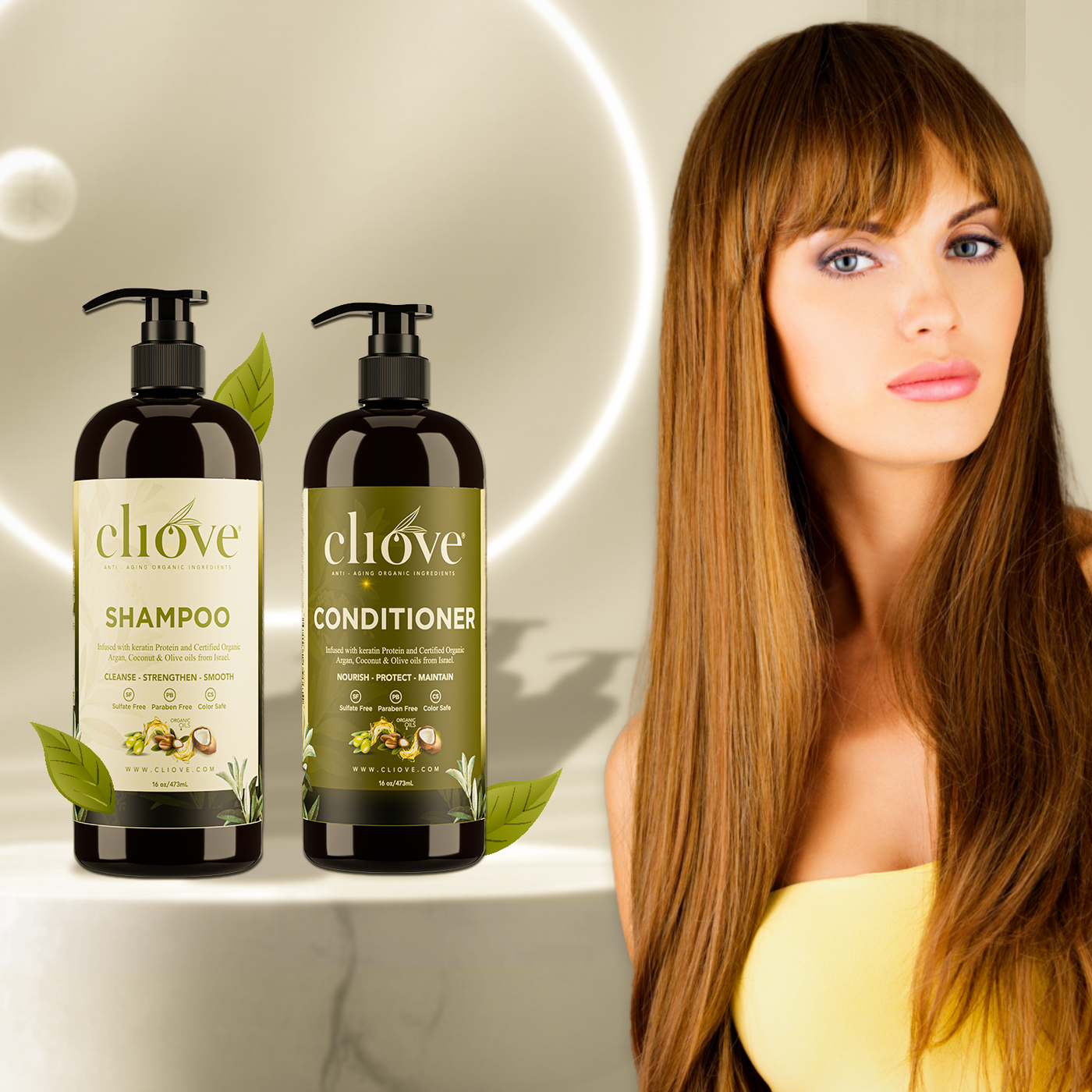 El Acondicionador Cliove también es conocido como Acondicionador Alisador o Anti-Frizz. Con la fragancia única de Cliove y apto para todo tipo de cabello, es un acondicionador de uso diario que mantiene cualquier tratamiento de Keratina, Alisado, Brasileño, Nanoplastia u otros tratamientos de alisado. No contiene parabenos ni sulfatos, no es probado en animales, es seguro para el color, y contiene ingredientes orgánicos y veganos certificados, importados desde Jerusalén, Israel, y fabricado en Miami, Florida, EE. UU.